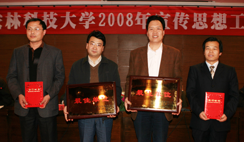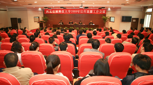校党委副书记、副校长王革代表学校对2007年度思想宣传工作进行了回顾总结,并对2008年工作作了安排部署。2007年,我校在理论武装工作、精神文明建设、思想文化建设以及舆论引导工作等方面均取得了显著的成绩。关于2008年学校宣传思想工作,王革说,2008年是我校“质量提高年“和“改革攻坚年”,根据宣传思想工作的指导思想和工作思路,具体要抓好五项重点工作,一是以学习贯彻党的十七大精神为重点,统一思想,凝聚力量,为学校改革发展奠定坚实的思想基础;二是以社会主义核心价值体系建设为根本,鼓舞士气,振奋精神,不断推进思想道德建设;三是以正确的舆论为先导,围绕中心,服务大局,着力营造好良好的舆论氛围;四是以开展群众性的精神文明创建活动为契机,把握重点,突出主题,不断提高师生员工的综合素质;五是以建设高水平研究型大学为目标,统筹规划,协调发展,全面推进大学文化建设。