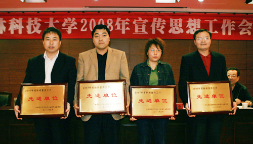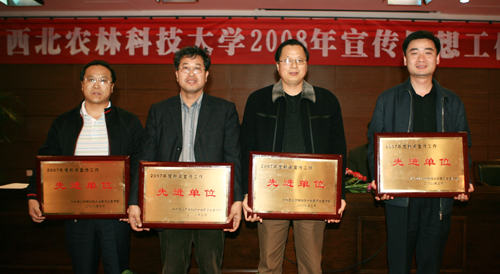 2007年度,我校图书馆和园艺学院获得陕西省教育系统精神文明建设“创佳评差”工作最佳单位称号,宣传部马军涛和人文学院王亚平两位同志获得陕西省教育系统精神文明建设先进工作者称号,校团委、学生处等12个单位获学校新闻宣传工作先进单位称号,何玉杰等17人获得学校优秀教工通讯员称号,《解析“动科现象”》、《朱清时院士报告会侧记》等20件作品被评为学校优秀新闻稿件。工作会上,这些获奖的集体和个人受到了表彰奖励,校领导张光强、王万忠、王革、赵忠为获奖的集体和个人颁发了奖牌。