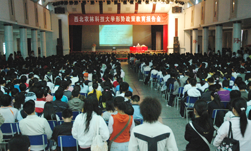 5月8日下午,北校区绣山大学生活动中心座无虚席、气氛热烈,陕西省高校德育研究中心主任、西安交通大学博士生导师卢黎歌教授为广大师生作了题为《弘扬爱国主义精神,维护中华民族根本利益》的形势政策教育报告,给大家上了一堂生动的爱国主义教育课。报告会由校党委副书记徐养福主持,学校部分处级干部、学生辅导员、政治理论课教师和学生代表1200多人听取了报告。