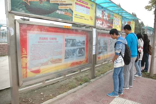 为庆祝中华人民共和国成立64周年,校党委宣传部在北校区宣传橱窗展出《共铸辉煌 实现梦想——热烈庆祝中华人民共和国成立六十四周年》主题图片展。