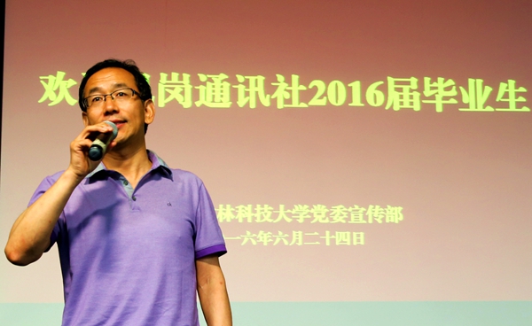 党委宣传部部长闫祖书向学生记者们的顺利毕业与就业表示祝贺。他说,到宣传部工作的两年时间里,见证了凤岗通讯社、新媒体联盟以及网评中心的成立,看到资源整合后学生记者队伍的进一步壮大,也看到了学生记者们用手中的笔和镜头对学校发展进步的生动记录,他代表宣传部对学生记者的辛勤劳动致以衷心感谢。他指出,凤岗通讯社是一个大学生宣传组织,也是一个很好的育人平台,广大学生记者在这里提高了写作能力、沟通交流能力以及组织策划能力,为今后走向社会打下了坚实基础。他希望毕业生们尽快适应新环境,在新的单位里继续发挥所长、坚持政治理论学习,争取做出更大成绩,并祝愿毕业生们前程似锦,明天更美好。