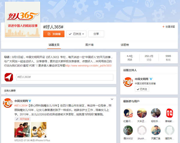 中国文明网、人民网、新华网、光明网、中国网络电视台以及全国各地百余家都市报刊在不同的地方、不同的版面,以不同的方式推同一个好人故事,是地方媒体和中央网站的大规模互动,也成为媒体融合报网互动的一次传播创新。丰富的内容来源、权威的发布平台、感人的故事情节,《好人365》故事受到广大网友的热情追捧,并迅速成为互联网的热门话题,截至今年9月21日,仅新浪微博的“好人365”话题访问量就已经达到了4.4亿,讨论量达252万人次,众多网友成为好人故事的忠实粉丝,也让一个个中国好人的名字家喻户晓。