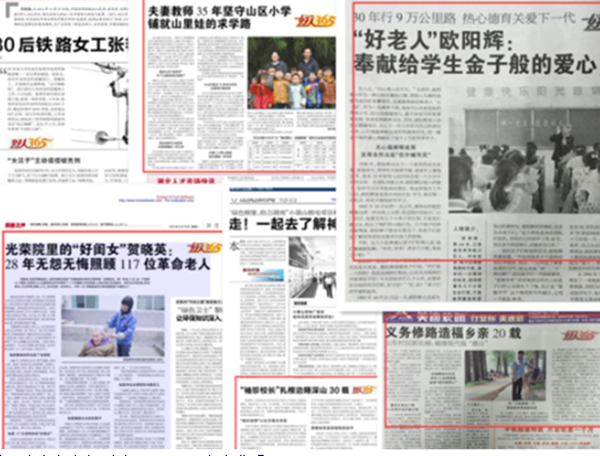 中国文明网《好人365》专栏依托中央文明办开展多年的“我推荐、我评议身边好人”活动,以讲故事的形式,每天讲述“中国好人榜”上榜人物的先进事迹和高尚精神,中央网站和全国各地的都市报刊互动跟进,微博、微信、移动客户端的加入,也给道德典型的传播报道带来了全新的气象。